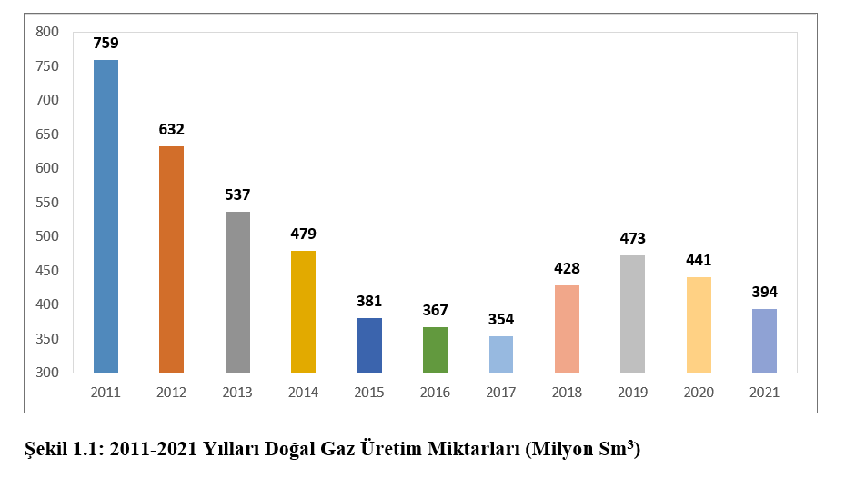 Türkiye’de geçmiş yıllara ait veriler incelendiğinde yaklaşık olarak 300-400 milyon metreküp doğal gaz üretildiği tahmin ediliyor. BOTAŞ verisine göre 2020 yılında doğal gaz üretimi 400 milyon metreküp olarak gerçekleşti.