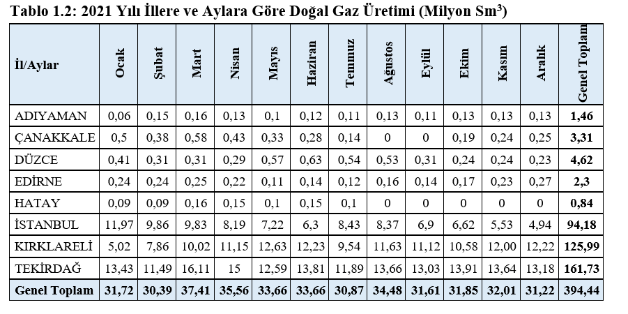 Üretim yapan toptan satış lisansı sahibi şirketler tarafından 2021 yılında gerçekleştirilen 394,44 milyon Sm3’lük doğal gaz üretiminin önemli miktardaki kısmı, TPAO, Thrace Basin Natural Gas Corporation ve Atlı Makine Turkey şirketleri tarafından gerçekleştirilmiştir. (T.C. Enerji Piyasası Düzenleme Kurumu)